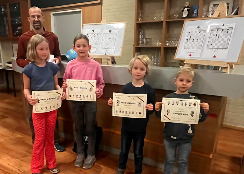 Nu was het de beurt aan Marie, Fieke, Simon en Stef, die uit handen van voorzitter Radboud het diploma overhandigd kregen.