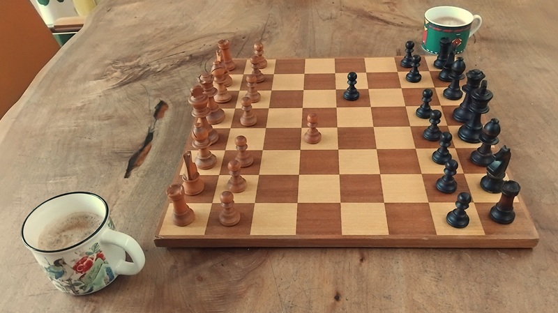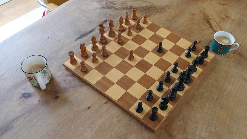 Dat leidde tot irritatie door irritatie. Daarom fotografeer ik mijn partijen van januari vanaf een statief. Ik experimenteer eerst in Twello, heeft geen jeugd. (Helaas, maar komt van pas.) Alleen al voor inschatten van de beste hoogte en de hoek van de camera. Recht over de tafel, half naast mij of iets ertussenin. Dat heeft geduld nodig om te leren bij ons vlot op te stellen.
