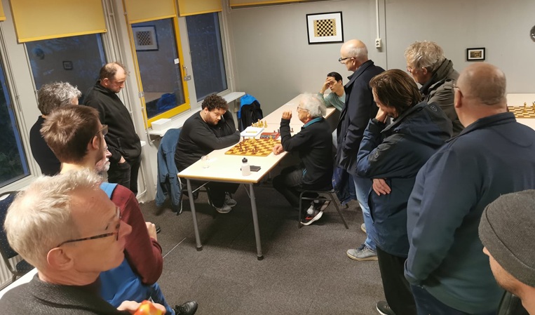 Dan MAX. Trouwe lezers van deze kolommen weten dat mijn toetsenbord geen kapitalen bevat, die uitdrukking kunnen geven aan mijn diepe bewondering voor onze meester-eter: in de herfstvakantie liet hij ons nog genieten van een prachtige overwinning op niemand minder dan Herman Grooten. Vandaag speelde onze man tegen Jan Lootsma, een routinier die bepaald een potje kan schaken. Maar dat kan MAX ook en met zwart aan bord 4 liet hij, in een stellingstype dat hem zeer bekend & lief is, al na vijf zetten veld b5 vrij voor een potentiële paardensprong, een mogelijkheid die op zet 19 tot realiteit werd. Zoals wel vaker de laatste tijd, hield MAX z'n koning in het midden, zette een paard op f5 en na het logische L:f5 en e:f5 vervolgde hij dynamisch en onverstoorbaar met een pionnenopmars richting de kort gerokeerde witte koning. Na ruim dertig zetten ontstond een zeer spanningsvolle stelling en iets van die spanning zal ook bezit van MAX hebben genomen, waarmee verklaard kan worden dat zijn notatie dan zo goed als onleesbaar wordt. Voor dit verslag maakt dit niet uit, want MAX zetten zijn voor de gemiddelde Palladiaan en ook voor steller dezes hoe dan ook van een peilloze ondoorgrondelijkheid. Na de tijdcontrole ontstond een eindspel, waarin MAX naar eigen zeggen een winst miste, door na te laten een setje torens te ruilen. Nu ontstond een eindspel met vier torens op het bord. Jan beschikte over ver opgerukte g- en e-vrijpionnen op de koningsvleugel, die van MAX, ter damezijde, waren ook vrij, maar bovendien verbonden, maar helaas nog wat verder van de overkant. Toreneindspelen saai?? Niets daarvan!! Alle spelers verdrongen zich om bord vier om maar niets van de strijd te missen, die tot tachtig zetten duurde en waarin beide mannen scherp moesten rekenen en waarin winst en verlies akelig dicht bij elkaar lagen. MAX’ mimiek verraadde dat hij op een paar momenten dacht het pleit beslecht te hebben en zo zijn team aan een wedstrijdpunt te helpen. Zijn aanhoudende winstpogingen brachten echter het beste in Jan naar boven, die steeds weer de juist resource vond, zijn e-pion liet promoveren en afwikkelde naar een eindspel waarin de witte koning op één tempo dicht genoeg bij de resterende zwarte vrijboer kwam, om deze onschadelijk te maken. De strijders schudden elkaar de hand toen er twee koningen waren overgebleven...