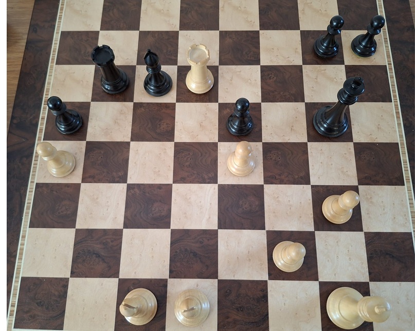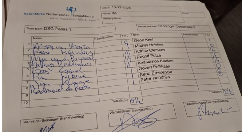 KNSB: Bekokstoofd (Pallas 1)Zo werkt het natuurlijk niet, maar je moet wat, wanneer je zoals Pallas 1 na drie nipte nederlagen een lucky 4-4 tegen Almere, stijf onderaan staat in Klasse 3A van de KNSB competitie 2025-2026. Smeken is echter niet naar MAX’ aard, gewérkt zal er worden, en daarom had hij het team opgeroepen voor trainingsbijeenkomst ter voorbereiding op het thuisduel tegen de Groninger Combinatie 3, dat een dag later gepland stond. Mens sana in corpere sano, luidt het gezegde en MAX, sfeergevoelig als hij is, liet de training dan ook voorafgaan door een zeer voedzame én lekkere maaltijd. Kenners van de Deventer horeca zal het niet verbazen dat MAX een potje kan schaken én koken en al geeft hij zijn recepten niet graag prijs, terecht houdt hij het voor genoegzaam bekend dat voor een overwinning aan het schaakbord één ingrediënt onontbeerlijk is. Stoof á la MAX Een strijdplan hadden we ook. Onze toppers zouden – hoe zeg ik dit modern – hun ding doen aan bord 1-2-3. “Keepen kan je overal” was het motto voor Matthijs en Bas en zij waren voor de gelegenheid naar plek 4 en 5 verhuisd. In onze staart zat in de toch zeer goedertieren persoonlijkheden van Pim, Jim en Radboud het venijn: daar zou een verrassingsaanval plaatsvinden. Qua ratinggemiddelde ontliepen de beide teams elkaar nagenoeg niets; onze ratingspreiding was breder dan die van de sympathieke Groningers. Drs. Capel sr. zal me wellicht gispen voor dit wetenschappelijk ongetwijfeld onverantwoorde taalgebruik. We zijn gewoon een heel divers team. Plan = Uitvoering De partijen. René opende de score, met wit aan bord 2 tegen Mathijs Huiskes. Na 24 zetten gaf deze er de brui aan, punt voor ons! Het leek erop dat René Mathijs uit de tent lokte, die deze laatste op de damevleugel wilde opslaan. Wit deed schijnbaar voorzichtige zetjes (hoewel hij even zijn e4-pion liet instaan, een kleinigheid waar zwart geen acht op sloeg), terwijl de Groninger zijn hele damevleugel, althans de pionnen, binnen 11 zetten liet opmarcheren naar diens vijfde (en Renés vierde) rij. Overextended of overextented, hoe dit ook zij, de tijd die zwart aan de boerenmars besteedde, werd door onze man gestoken in het ontwikkelen van zijn stukken, de korte rokade en het centreren van zijn torens. Al snel dreigde zwarts Le7 gepend te worden door Te1, paardvorkjes op b6 hingen in de lucht en toen Mathijs begrijpelijk, maar foutief, want te laat, kort ging, brak René met een welgemikt d4-d5 de stelling open, de baan brekend voor de witte toren om dood en verderf te zaaien, die al ras geoogst werd. Hulde! Na een kleine drie uur spelen werd het remise aan bord 3 en 4, in die volgorde. MAX en Matthijs zaten wat erg knus naast elkaar aan de bepaald smal uitgevallen tafels bij Thomas Wildey. Nu is MAX in de breedte wat sterker ontwikkeld dan steller dezes – hij haast zich hieraan toe te voegen: ook in de lengte en in de diepte, en dit alles zowel letterlijk als figuurlijk. Voeg hieraan toe dat MAX mij had opgedragen a. snel te spelen (vooral zet 5-10), b. remise te maken en c. maar dit niet eerder dan dat hij (MAX) het goed vindt, en de lezer begrijpt dat ik me toch wat ongemakkelijk en bekeken voelde. Van de andere kant: MAX’ nabijheid inspireerde me tot mijn hardste betonschaak ooit en Rudolf Potze kwam nooit in de buurt van een voordeeltje. Ik ook niet. Ook bij MAX werd van dik hout geen planken gezaagd. Adrian Clemens deed de afruilslaaf, bouwde met d4-e3-f4 een stenen muurtje, maar merkte dat MAX met een uitgestreken gezicht eenzelfde hindernis opwierp. Nadat alle zware stukken geruild waren over de c-lijn, vroeg de als altijd oplettende MAX beleefd aan Adrian of deze remise aanbood, want dat had de Groninger met “(=)” aan diens notatiebiljet toevertrouwd. Adrian was echter vergeten het even te vragen, maar al snel werden de handen geschud. Dit was voor mij het sein om de totaal vervlakte stelling nog verder te vervlakken, MAX vragend aan te kijken en na diens “goed”, dat meer als een bevel dan als een instemming klonk, remise aan te bieden. Dat vond Rudolf oké. Ik zat nog maar net de vele subtiele nuances, die onder het met Rudolf gestorte beton schuilgingen, te onderzoeken, toen René mij opdroeg de analysetafel te ontruimen en plaats te maken voor Jim en diens tegenstander Reno Emerencia. Nu was dat wel begrijpelijk, want Reno en Jim hadden aan bord 7 een mooie pot gespeeld. Reno stond met wit lang beter dan beide combattanten vermoedden, eigenlijk bleef het evenwicht best lang bewaard. Aldus Dr. Engine, maar optisch en praktisch leek het beter voor Jim. Die stond klaar om met Ta8-b8-b4-c4-g4 de kort gerokeerde witte koning te bedreigen. Dit alles in combinatie met Lf8-c5, Pf6-g4 en f7-f5-f4:g3:f2, op zijn Jims dus. Opmerkelijk was het evengoed, dat in de opening de witte aanval op Pc6 en Ta8, door de vereende krachten van Da4-Lg2-Pe5, die door Jim vakkundig werd gepareerd, door het beest als +1,3 voordelig voor Reno werd getaxeerd. Voor een leuk interview met Anish Giri over het verschil tussen het menselijke en de computergestuurde stellingsoordeel verwijs naar de Schaaksite. Maar een mooi en belangrijk punt voor Jim! Pim won met wit van Govert Pellikaan. Zijn partij leek een beetje op die van René. Ook hier een quasi-rustige witte opzet, ook hier een opmars van zwarte pionnen, in dit geval in de structuur c6-c5-d4, die echter voornamelijk zwak werd en door paarden op b3 en c4 in samenwerking met de witte dameloper Le3-d2-c3 aan flarden geschoten werd. In arren moede besloot Govert (die zich op onze 4e bord speler had voorbereid, opzetje geslaagd) zijn paard op d5 te offeren, waarmee zijn stelling, die al heel slecht was, maar een klein beetje nog slechter werd. Weer een punt voor Pim, die daarmee op 2:2 kwam, en de stand op 4-1 zette. Radboud bracht het tweede matchpunt binnen. Met wit speelde hij aan bord 8 tegen Peter Hendriks, die een Stonewall op het bord toverde. Was het de aanwezigheid van Martijn Hage, die even kwa